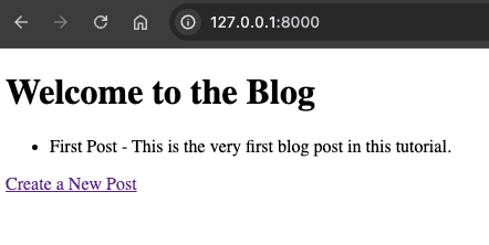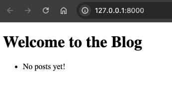 src/apps/blog/templates/blog/home.html<!DOCTYPE html><html lang="en"><head><meta charset="UTF-8"><title>Django Blog</title></head><body><h1>Welcome to the Blog</h1><ul>{% for post in posts %}<li>{{ post.title }} - {{ post.content }}</li>{% empty %}<li>No posts yet!</li>{% endfor %}</ul></body></html>